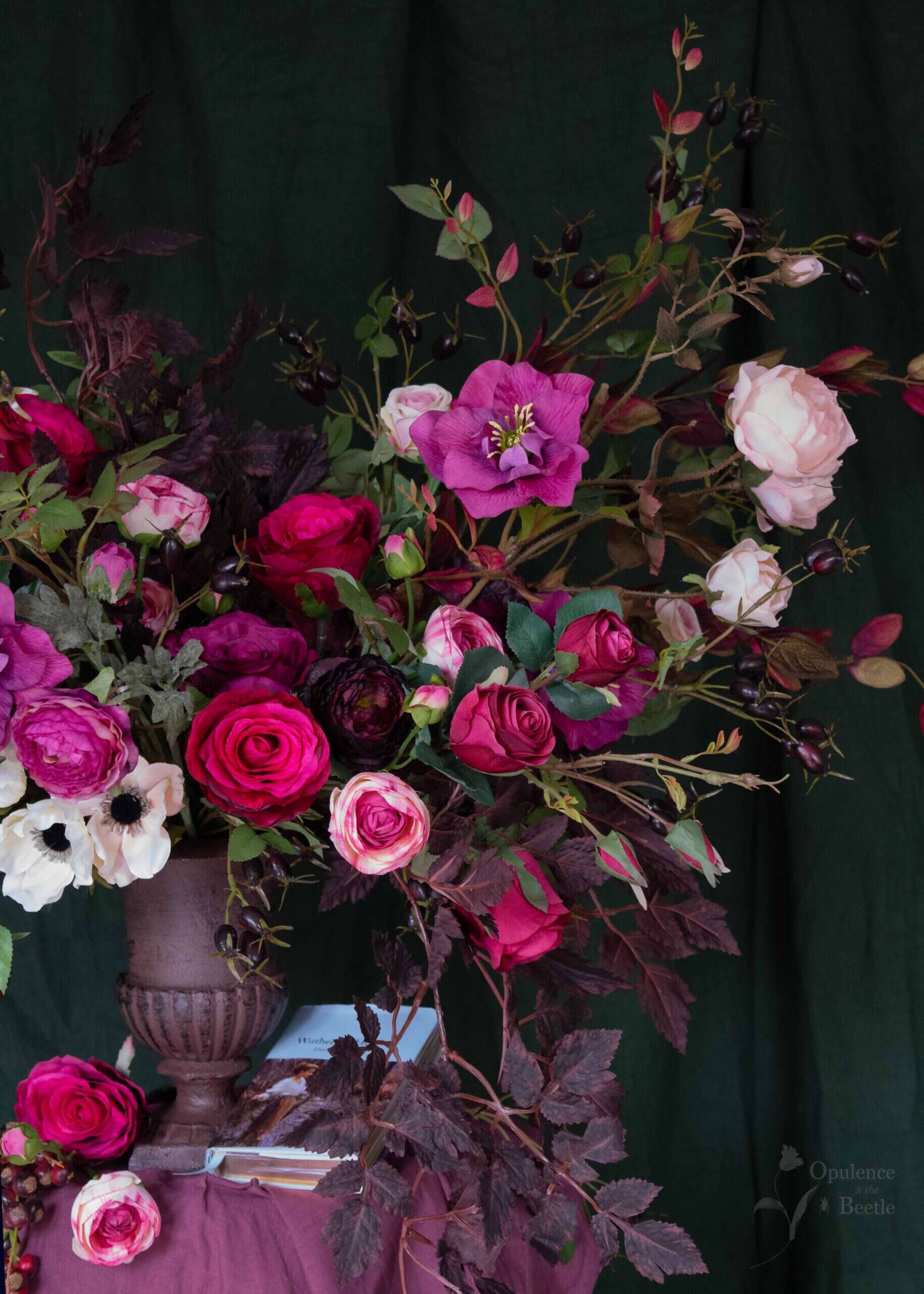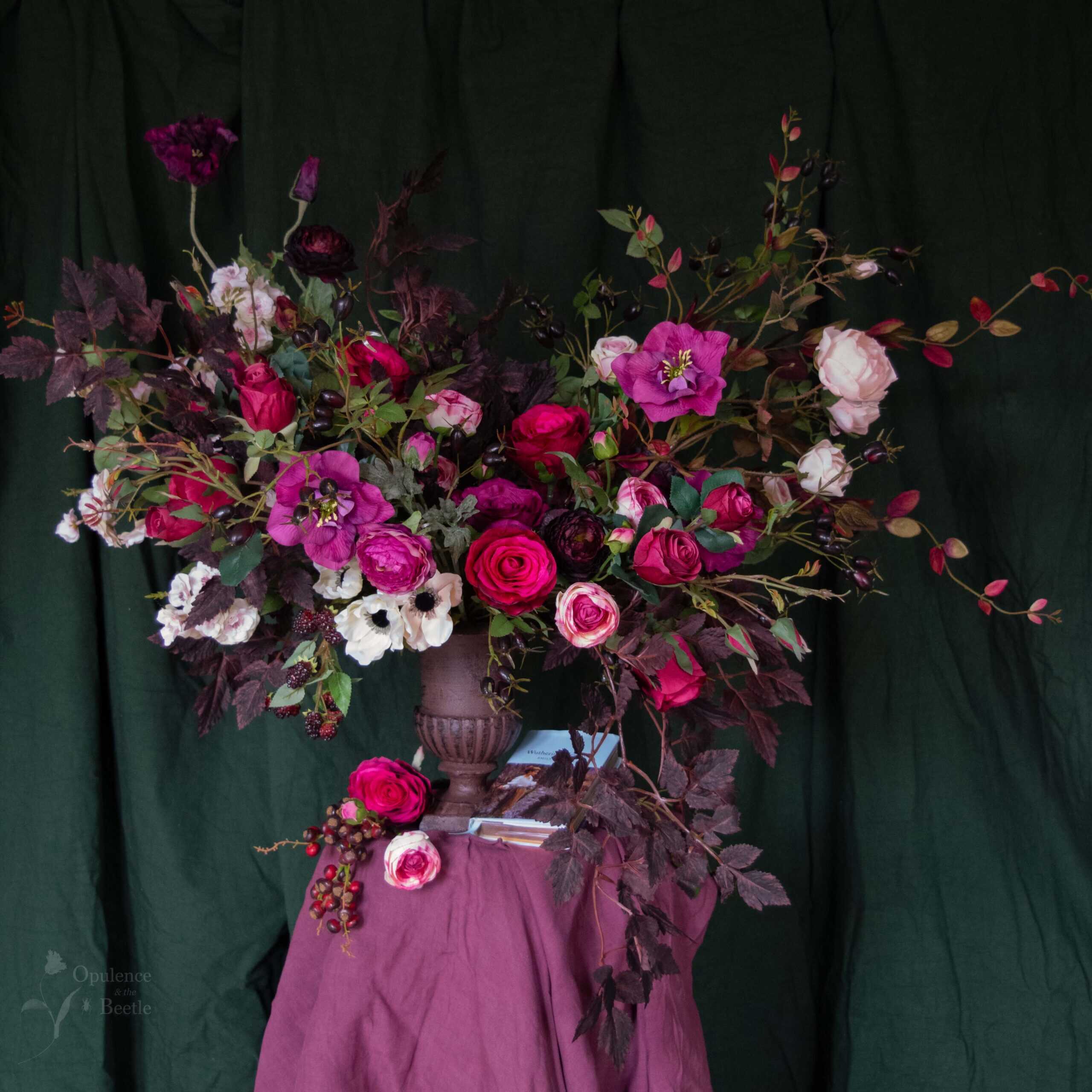 Wild, passionate and impossible to pin down. Catherine is an arrangement which celebrates windswept moors, stormy hearts and romance that simply refuses to fade. Roses, ranunculus, anemones and hellebores in damson, crimson, purples and nude pinks are scattered amongst wild wisps of honeysuckle, brooding black rosehips and tumbling burgundy foliage. Glistening blackberries spill over the edge of the dark, new, cast iron urn, whilst a deep purple poppy stretches its long neck into the wind. Measuring approximately 110cm in width, 72cm in height and 70cm in depth, this is a vast, untamed arrangement which celebrates Catherine’s tempestuous love for Heathcliff.