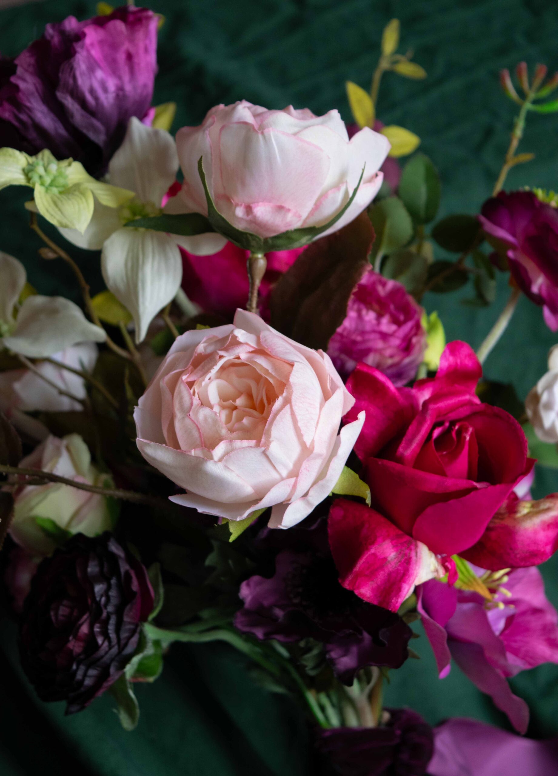 I take enormous pride in sourcing the highest quality stems and the majority of my suppliers only produce stems in colours and textures which are true to original flora. Some of my stems are ‘real touch’ which means they will convince even the hardest skeptic. Occasionally I will include artificial blooms in a non-authentic colour if I feel that they add interest to a design, but my only consistent exception to realism is Christmas when I let my imagination run wild. You’ll find splashes of gold, tiny baubles and even jewels included in these arrangements as I embrace the festive season and bring twinkle and sparkle to the shorter days.