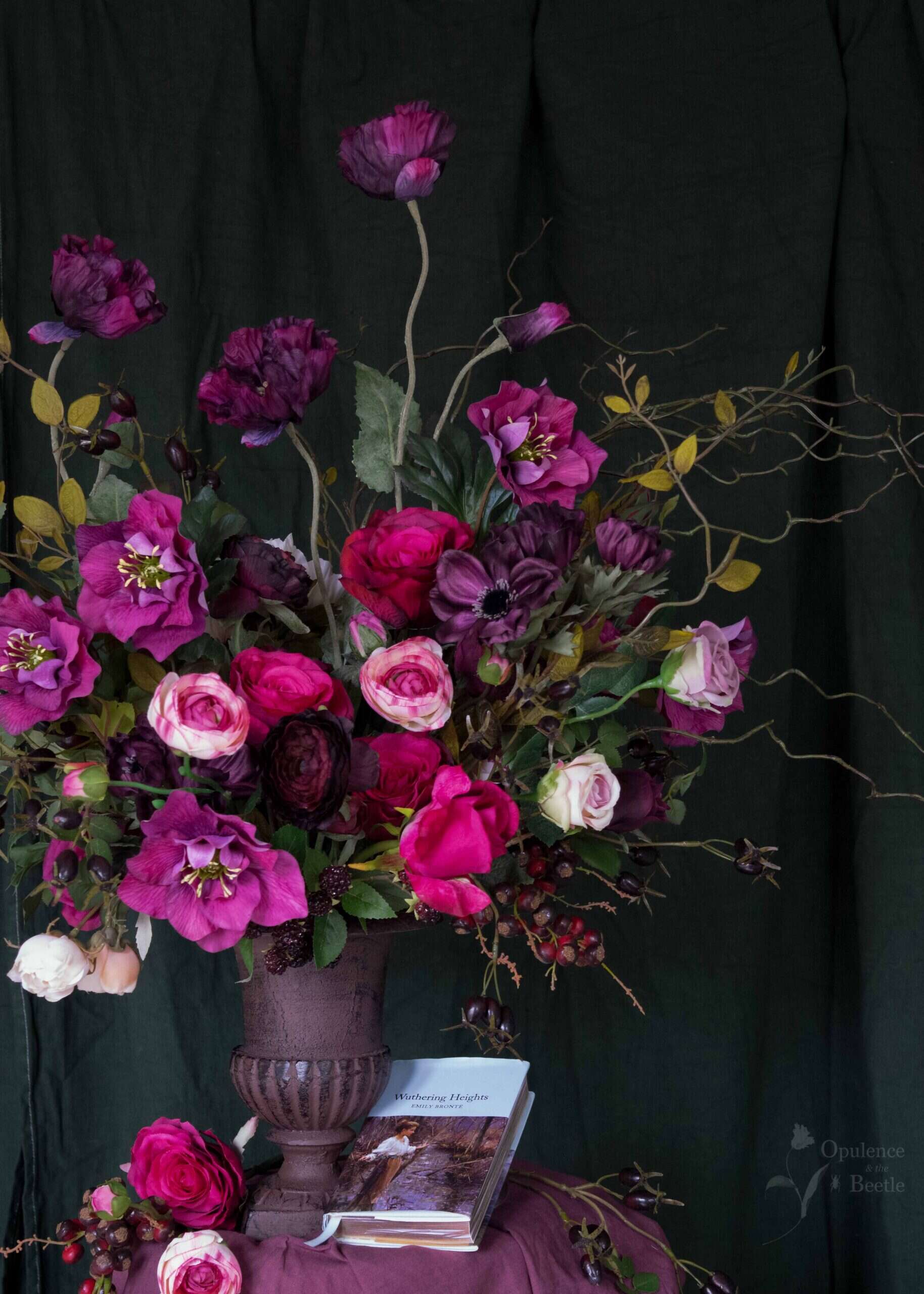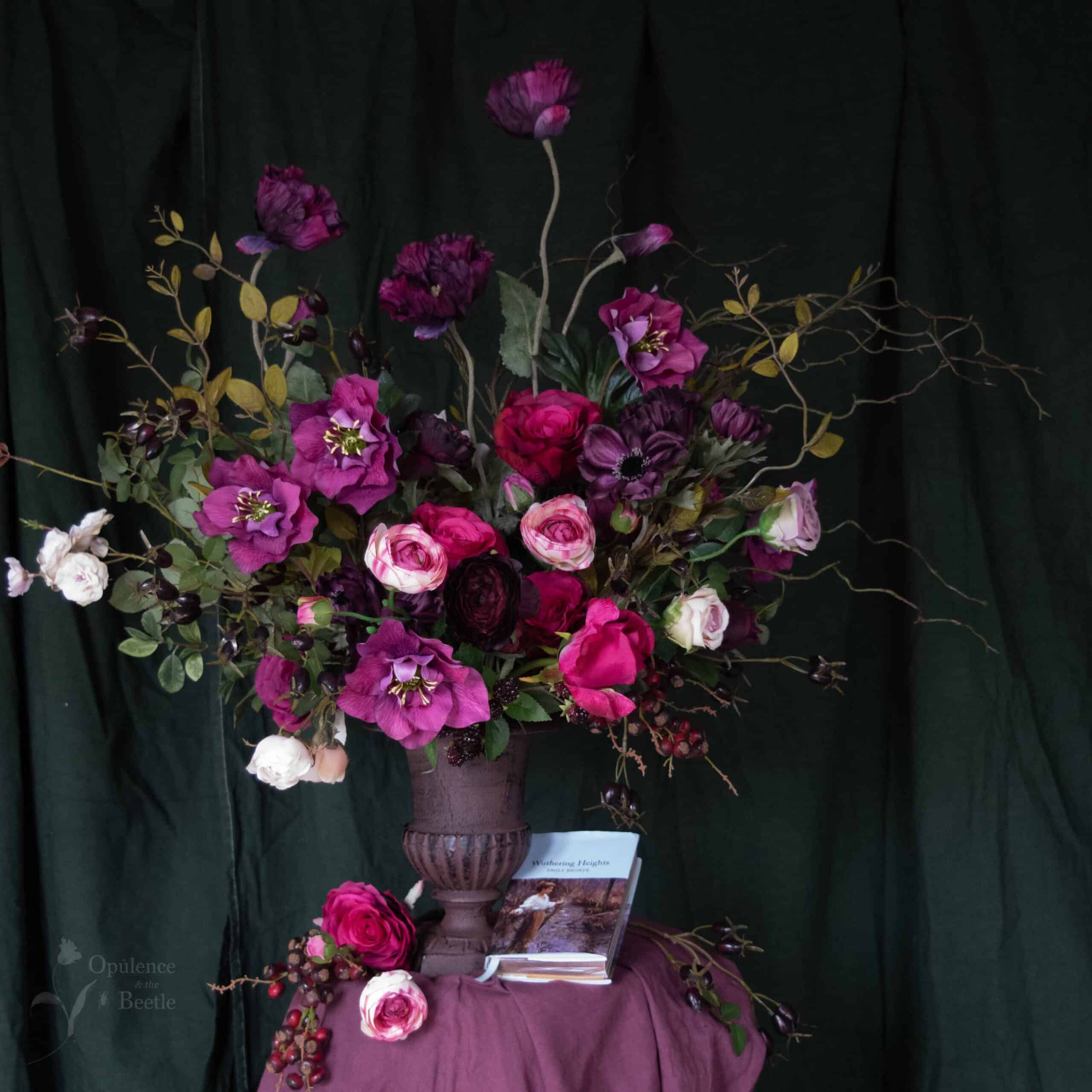 Dark, unkempt and as rugged as the moors themselves…but with aspirations which rise up from a twisted and complicated beginning. This arrangement celebrates Hareton, perhaps my favourite character in the wildly romantic tale of Wuthering Heights, with a trio of deepest purple poppies reaching up from a tangled bed of intertwined willow stems, wisps of honeysuckle and brooding black rosehips. A deeply loving heart is given form with roses, ranunculus, anemones and hellebores in damson, crimson, purples and nude pinks, whilst glistening blackberries spill over the edge of the new cast iron urn. Measuring approximately 85cm in width, 75cm in height and 50cm in depth, this is an arrangement which symbolises Hareton’s steadfast love and adulation for the younger Catherine and even Heathcliff.