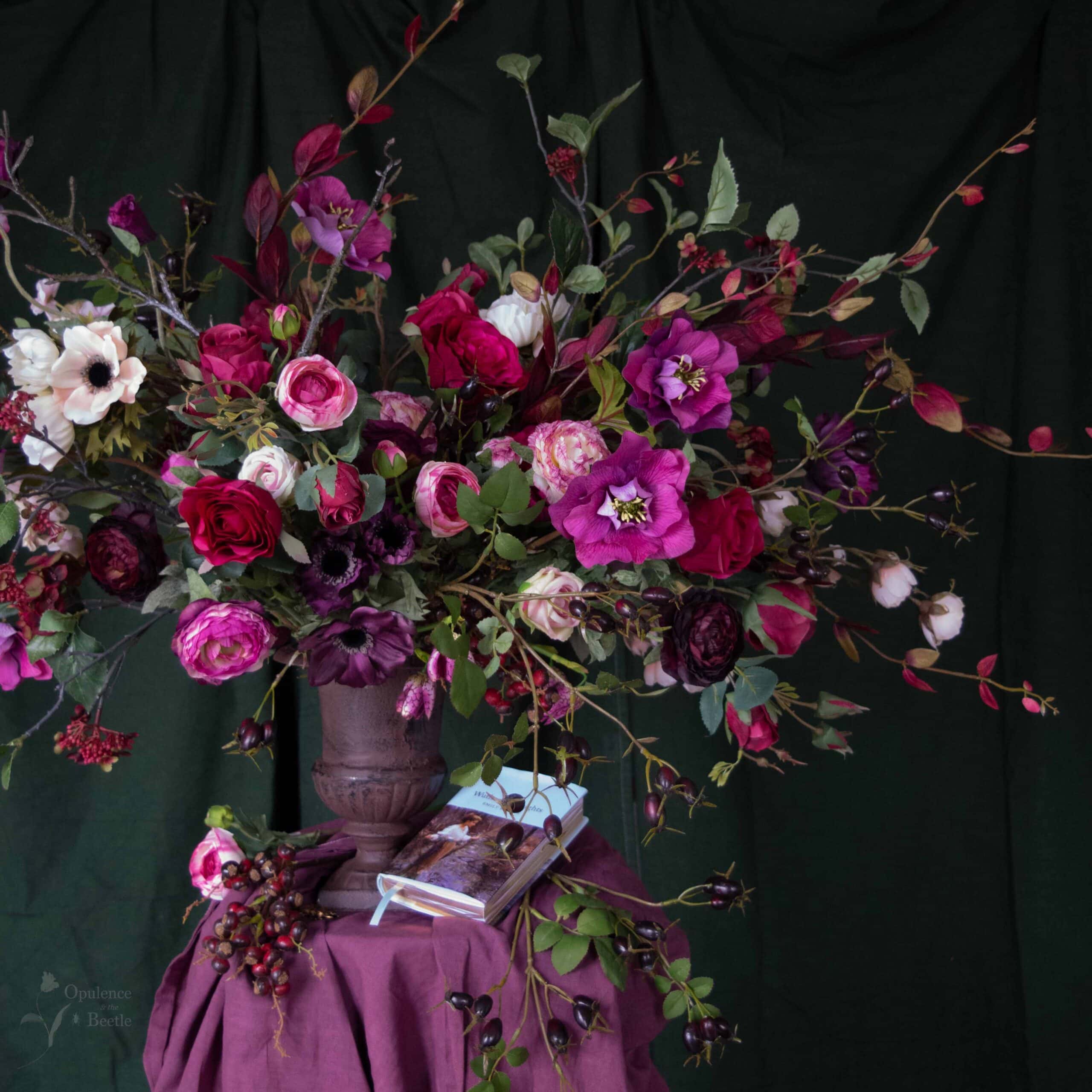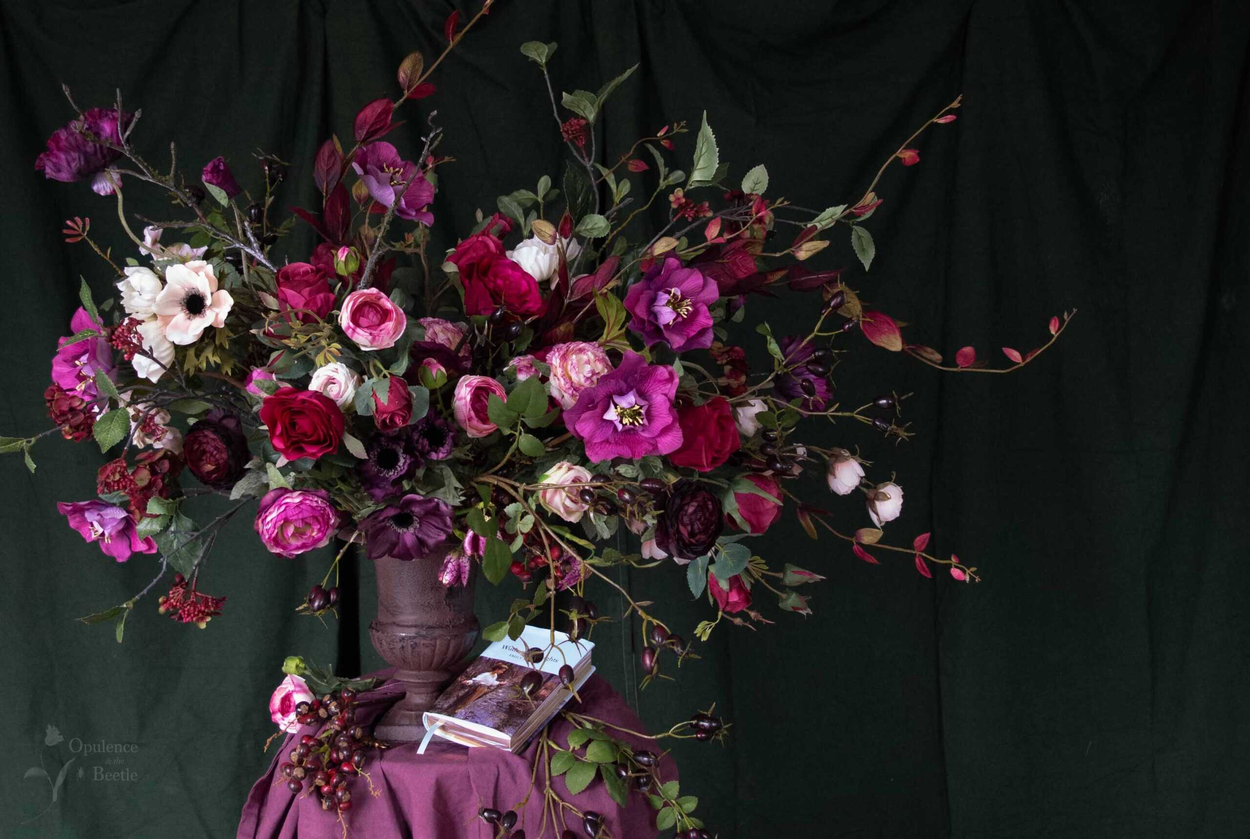 Dark. Passionate. Deeply complicated. Inspired by the raw intensity of Wuthering Heights, Heathcliff is not a quiet love letter: it’s a declaration. Roses, ranunculus, anemones and hellebores in damson, crimson, purples and nude pinks are scattered amongst wild wisps of honeysuckle, brooding black rosehips and russet red hydrangea. Skulking snake’s head fritillary nods over the edge of the dark, new, cast iron urn, whilst deep purple poppies stretch their long necks into the wind. Measuring approximately 115cm in width, 75cm in height and 60cm in depth, this is a vast, untamed arrangement which is as brooding and adoring as its namesake.
