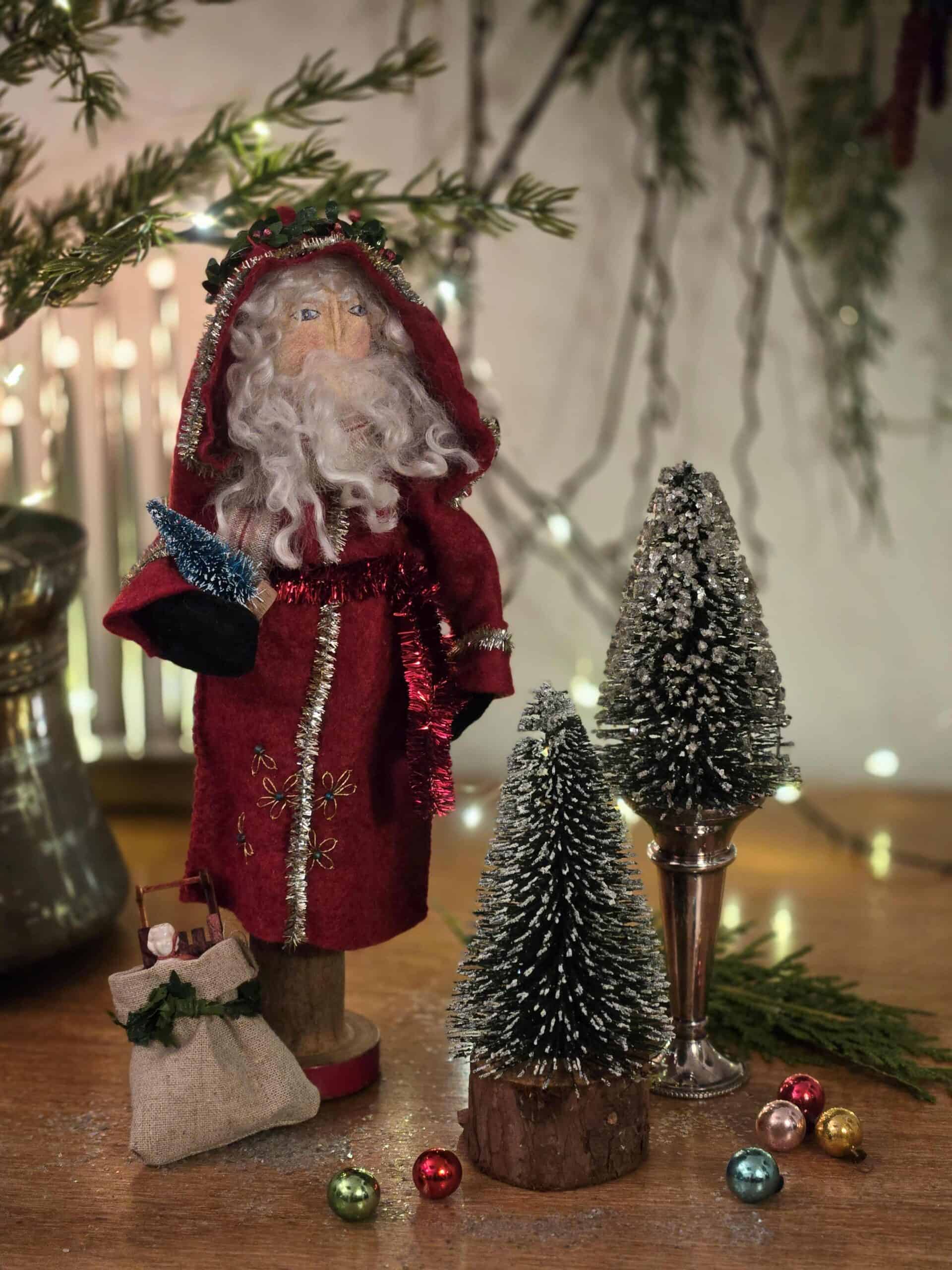 The Old Man of the Woods figures are made by my dear Mum and I and they are true heirloom pieces. We use vintage bobbins sourced from Yorkshire for the bodies and beautiful curly wool from Wensleydale sheep for the hair and beards. We carefully age both the outfits (made from Yorkshire wool felt) and the tinsel, hand paint the faces and then hand embroider the outfits. Each Old Man is lovingly paired with tiny aged toys and objet; some are also combined with the spun cotton geese made by my Mum. They really are a labour of love! This fellow is sold with a tiny fir tree under his arm, a miniature handmade wreath on his head and a beautiful linen sack filled with a tiny dolly and sledge.