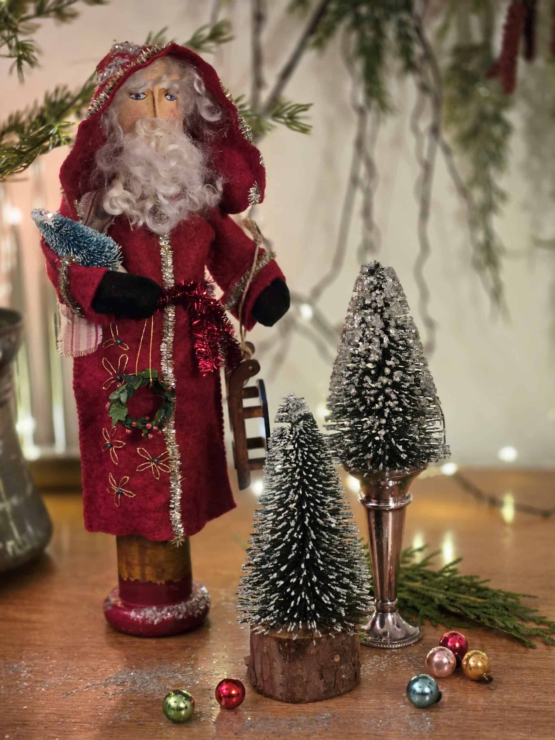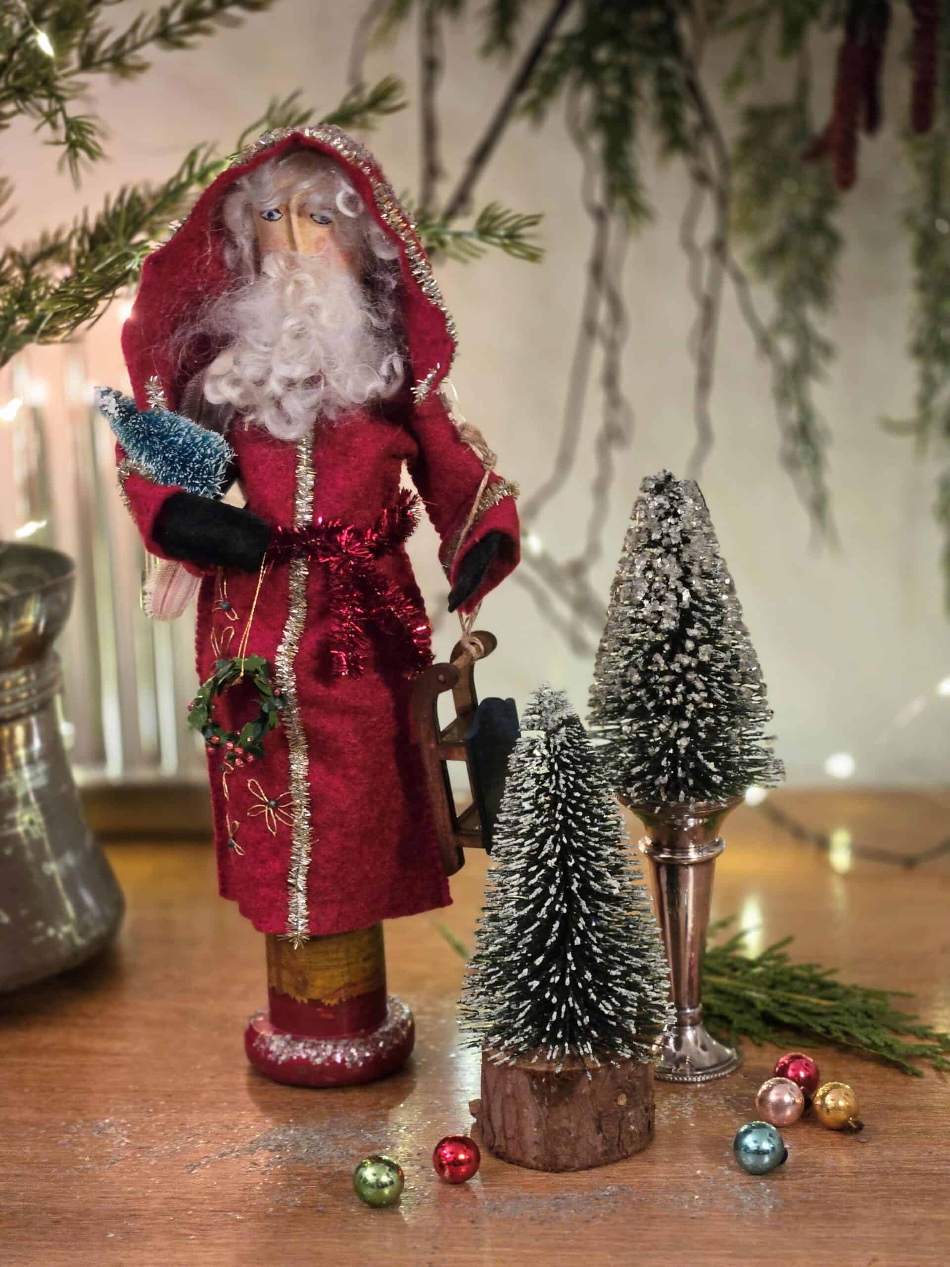 The Old Man of the Woods figures are made by my dear Mum and I and they are true heirloom pieces. We use vintage bobbins sourced from Yorkshire for the bodies and beautiful curly wool from Wensleydale sheep for the hair and beards. We carefully age both the outfits (made from Yorkshire wool felt) and the tinsel, hand paint the faces and then hand embroider the outfits. Each Old Man is lovingly paired with tiny aged toys and objet; some are also combined with the spun cotton geese made by my Mum. They really are a labour of love! This fellow is sold with a tiny fir tree under his arm, a hand-painted sledge on his arm and a miniature wreath hanging from his belt. Finally, his head and shoulders are dusted with subtle Mica flakes.