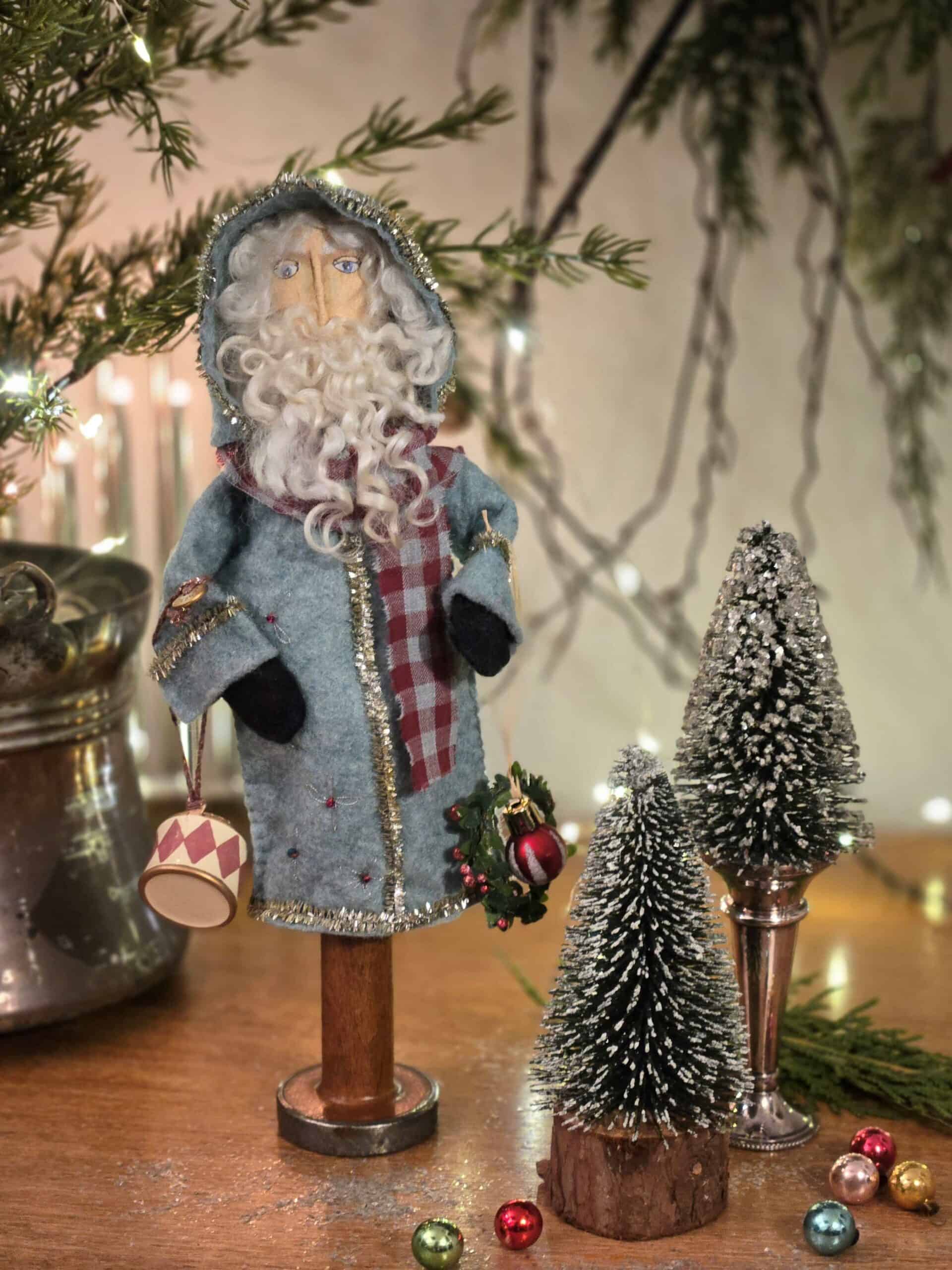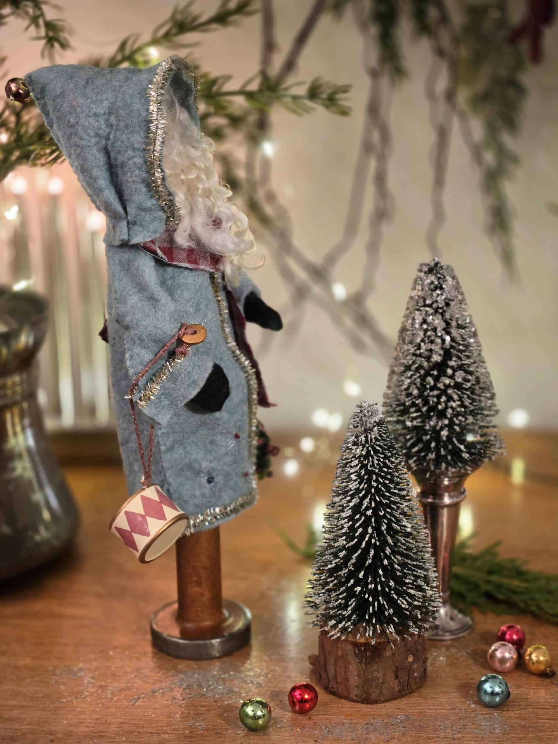 The Old Man of the Woods figures are made by my dear Mum and I and they are true heirloom pieces. We use vintage bobbins sourced from Yorkshire for the bodies and beautiful curly wool from Wensleydale sheep for the hair and beards. We carefully age both the outfits (made from Yorkshire wool felt) and the tinsel, hand paint the faces and then hand embroider the outfits. Each Old Man is lovingly paired with tiny aged toys and objet; some are also combined with the spun cotton geese made by my Mum. They really are a labour of love! This fellow is sold with a tiny drum and a miniature hand-made wreath.