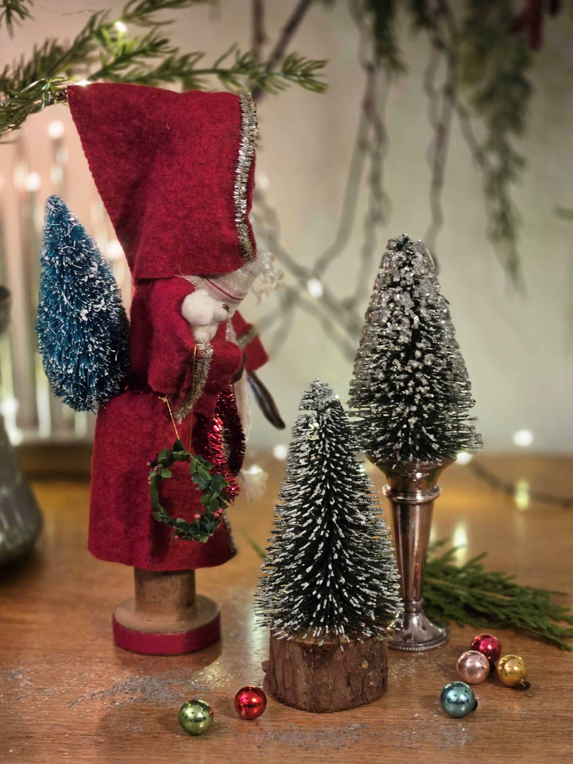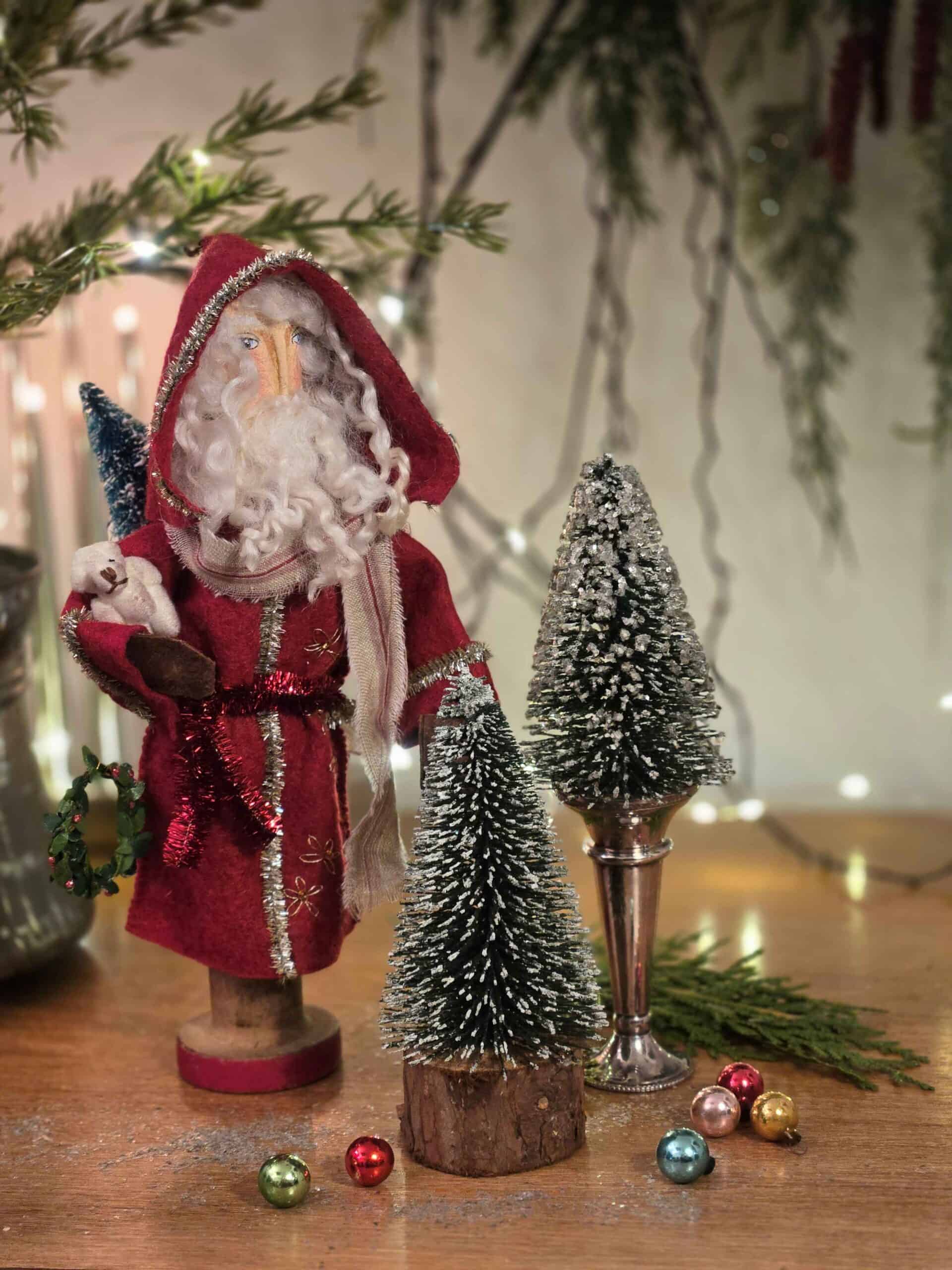 The Old Man of the Woods figures are made by my dear Mum and I and they are true heirloom pieces. We use vintage bobbins sourced from Yorkshire for the bodies and beautiful curly wool from Wensleydale sheep for the hair and beards. We carefully age both the outfits (made from Yorkshire wool felt) and the tinsel, hand paint the faces and then hand embroider the outfits. Each Old Man is lovingly paired with tiny aged toys and objet; some are also combined with the spun cotton geese made by my Mum. They really are a labour of love! This fellow is sold with a tiny bear under his arm, a beautiful fir tree on his back and a miniature wreath on his belt – and his mittens are made from leather.
