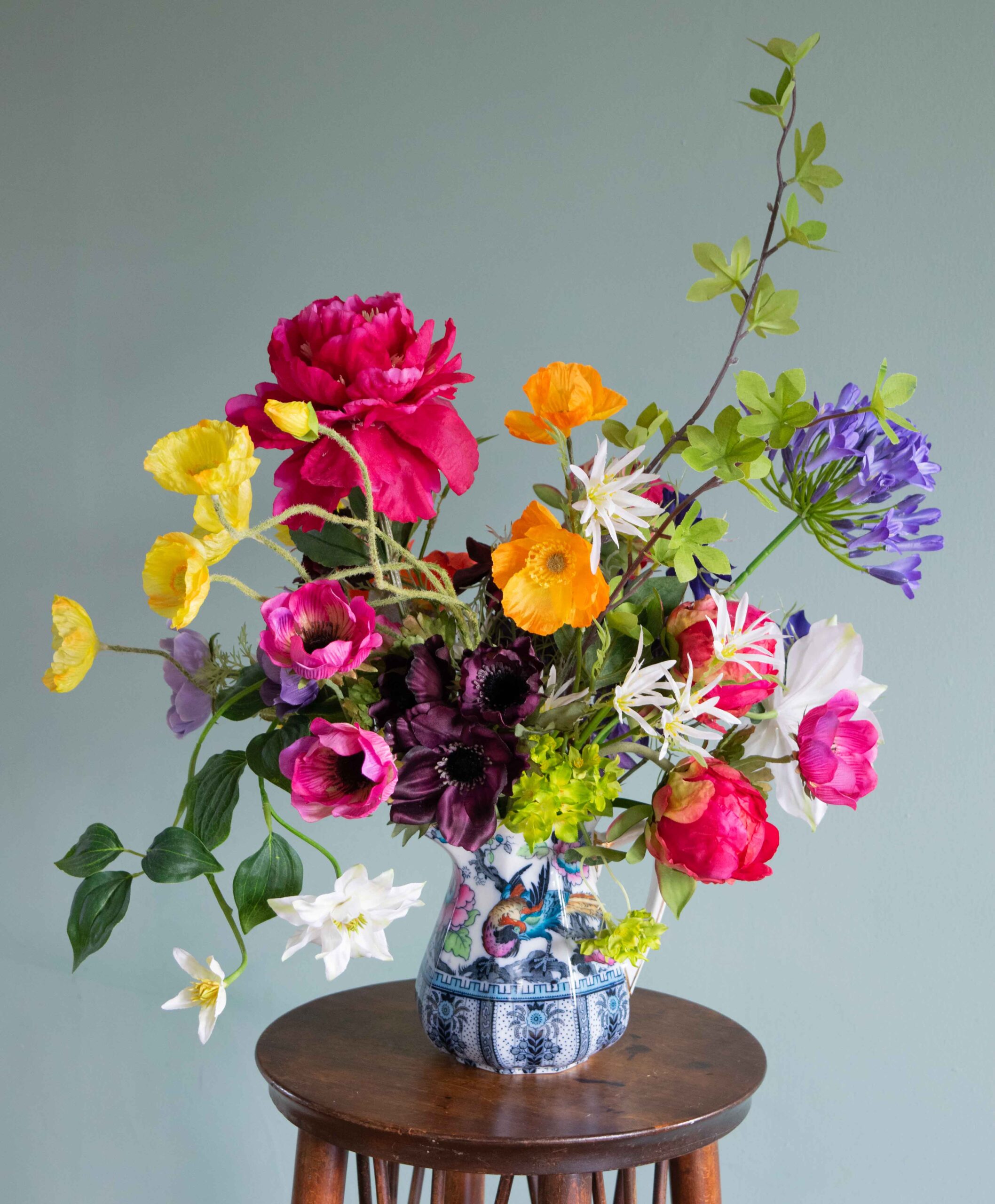 Created to celebrate this beautiful LosolWare jug in the ‘Shanghai’ design, Paradise Garden brings together an array of fabulous and colourful blooms which will bring joy to any interior space. Stunning pink peonies are combined with anemones, delicate camassia, vibrant poppies, textural agapanthus and twirling clematis to create a really uplifting arrangement.