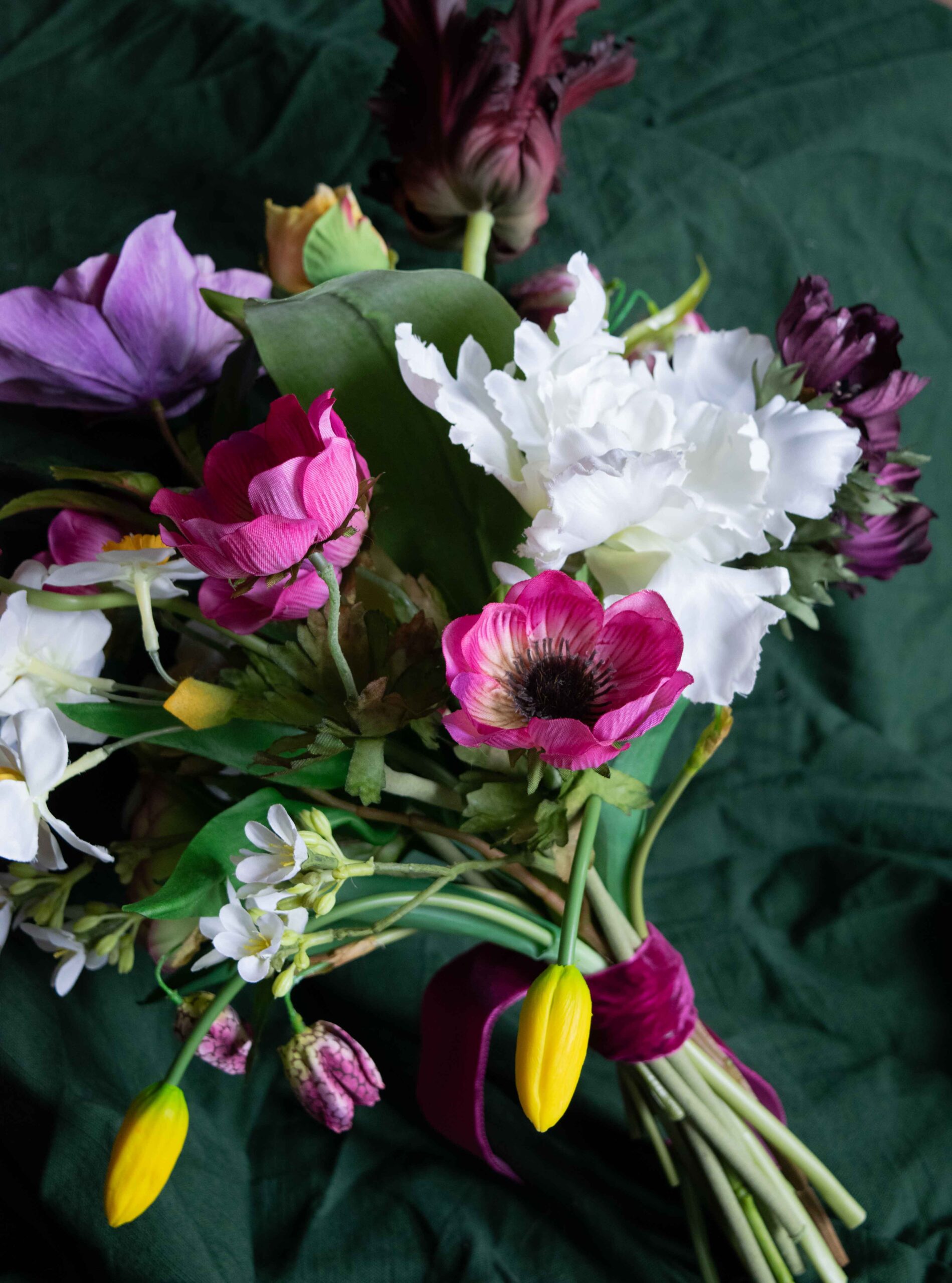 Celebrating the softness and delicacy of fresh Spring blooms, this hand-tied bouquet combines a pale lemon peony with anemones in rose pink and purple, nodding snake’s head fritillary, cream and yellow narcissi, soft green ranunculus and a fabulous purple hellebore. Finishing the arrangement are a pair of head-turning parrot tulips in aubergine and white and a sprinkling of real touch tulip buds.