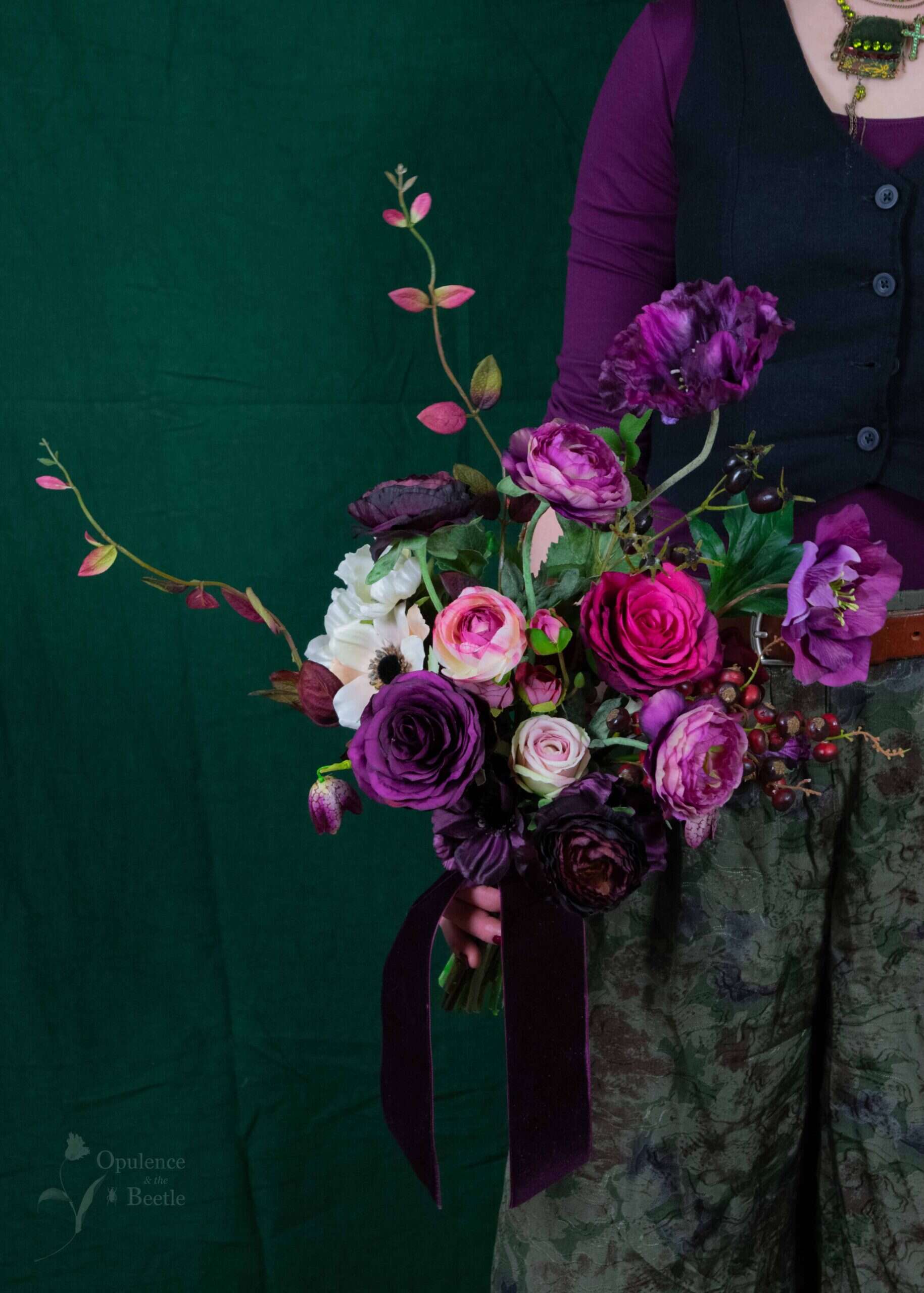 A dark, brooding, hand-tied bouquet celebrating windswept moors, stormy hearts and love which refuses to fade. This limited edition set of 10 bouquets features roses, ranunculus and anemones in damson, crimson and nude pink, alongside brooding black rosehips and wild wisps of honeysuckle. A deepest purple poppy and stunning purple hellebore give height to the bouquet, whilst skulking snake’s head fritillary nods beneath the larger blooms. Whether you’re channelling Catherine and Heathcliff or simply want flowers that won’t wilt when